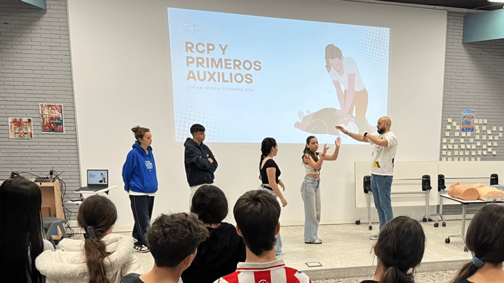 La semana pasada con motivo del Día Mundial de la Salud celebrado el 7 de abril, el alumnado de ciclos formativos de grado superior de Integración Social y Animación Sociocultural y Turística, a través de la metodología de aprendizaje-servicio y en colaboración con el departamento de Educación Física, formó a estudiantes de secundaria en actuaciones básicas ante una emergencia vital. Adquiriendo competencias profesionales en primeros auxilios mientras prestan un servicio real a la comunidad educativa.